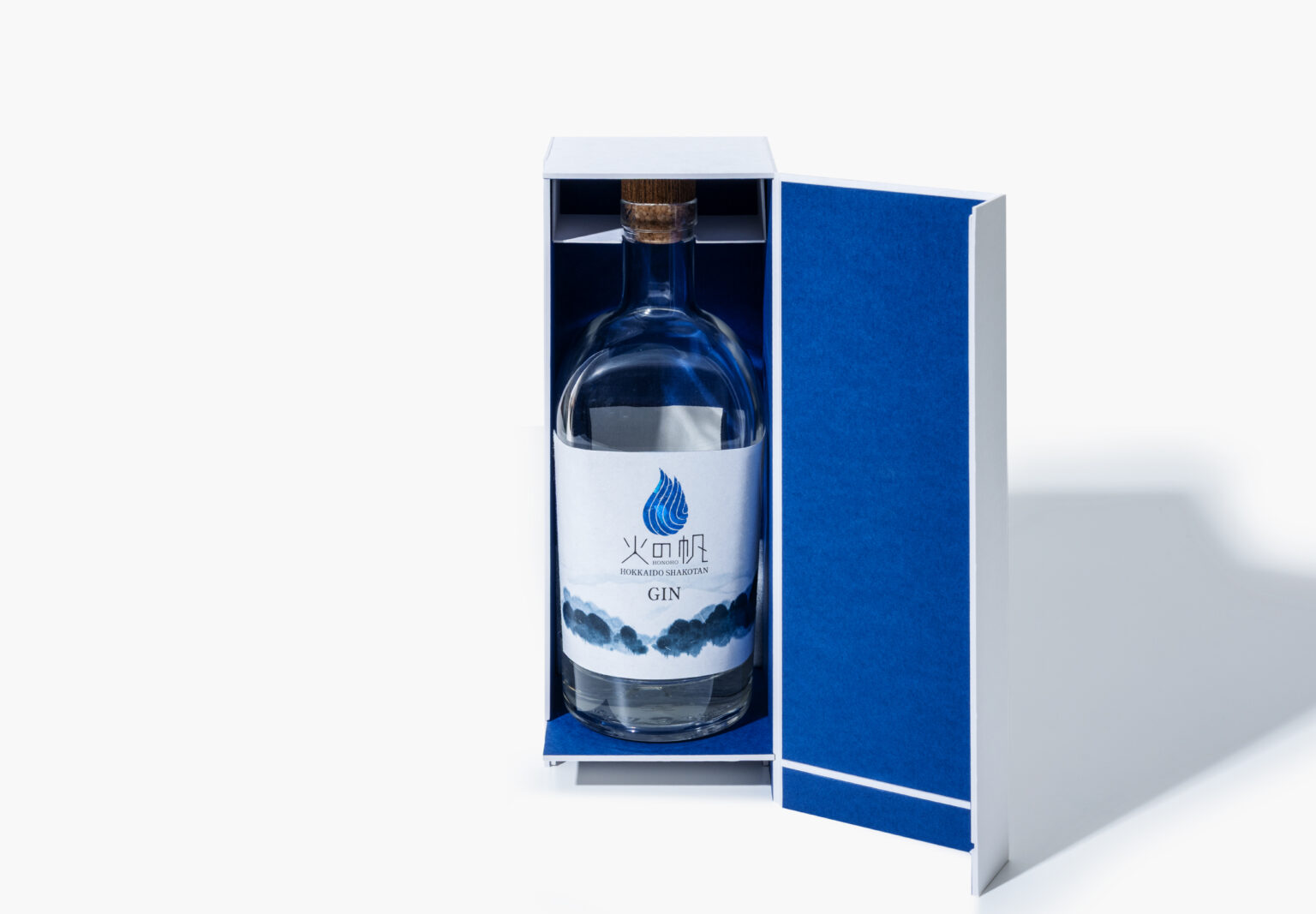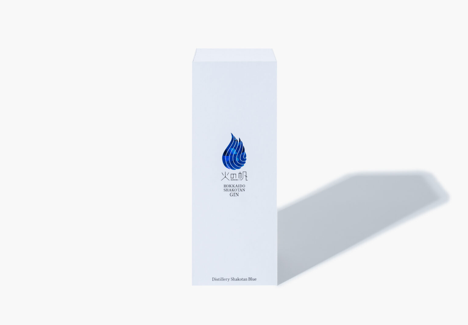The outer white paper and inner cobalt blue paper represent the snowfields and sea surrounding the distillery. The logo, embossed with blue holographic foil, makes a striking impression.